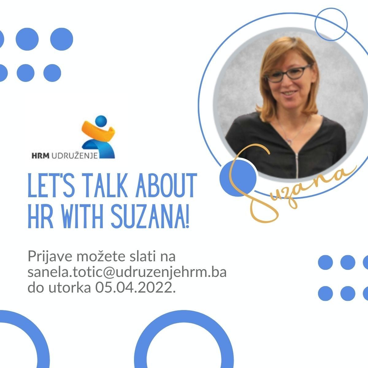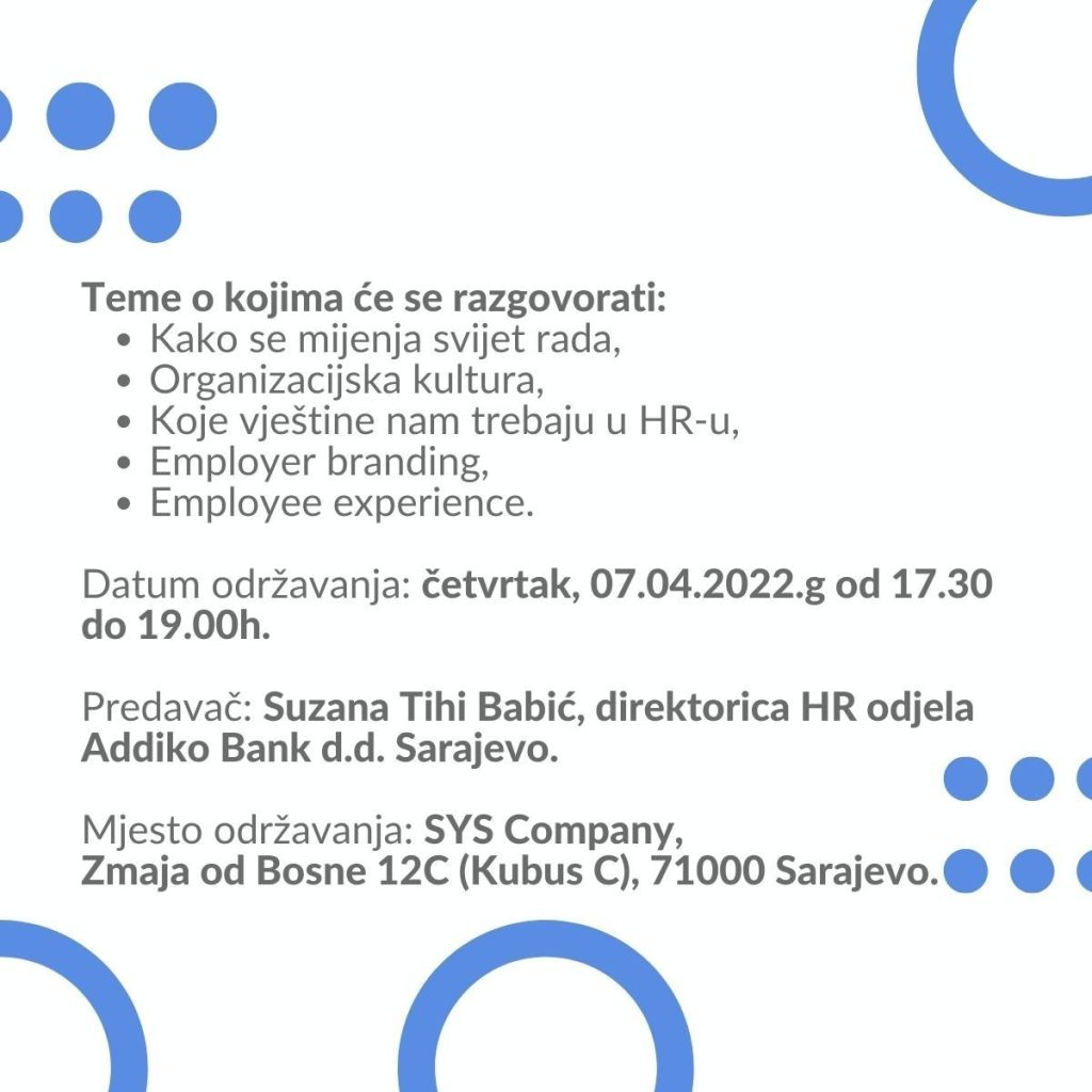 EDUKACIJE Let's talk about HR with Suzana! 20/03/2022 FacebookTwitterWhatsAppLinkedinViber Pridružite nam se 07.04. na interaktivnoj radionici sa stručnjakinjom Suzanom Tihi Babić, direktoricom HR odjela Addiko bank dd Sarajevo , akoja već 20 godina razvija HR sisteme i prakse. Više informacija na sanela.totic@sanelahrm.ba